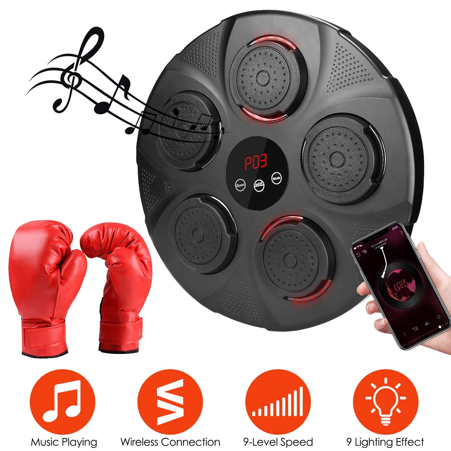It\'s a portable compact but efficient and fun boxing equipment. Designed with 9 modes of jumping red light to improve your reaction speed, endurance, or help you keep fit or lose weight. You can adjust 9 levels of speeds, suitable for both novices and boxers, both kids and adults. Wireless connecting mode allows you to play the music you like while boxing, greatly enhancing your experience and having more fun. Just stick the hook&loop strip on the wall and paste the machine, then you can enjoy the boxing fun. We also provide you with a pair of gloves for using. Adults/Kids/Half Finger Gloves can be chosen according to your needs.